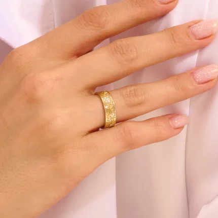 Get this Product in 18K Gold "Elegant 14K Gold Leaf Band – a dainty floral vine design, perfect for stacking or wearing alone, adding a delicate, nature-inspired touch to any collection."