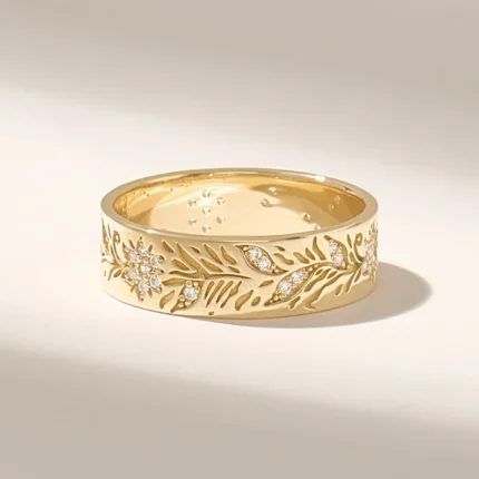 14k Gold Leaf Engraved Band: Nature-Inspired Vine Wedding Ring with Tiny Diamond