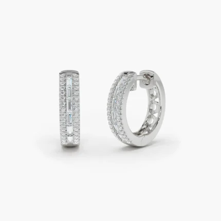 18k Solid Gold Pave Moissanite Diamond and Baguette Hoop Earrings