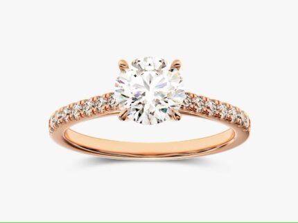This 14K Solid Gold Round Diamond Engagement Ring features a stunning central round diamond with pave set side stones, offering a captivating sparkle.