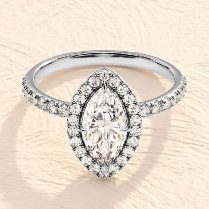 3ct lab-grown pear diamond halo ring in 18K gold. F-G color, VS clarity, IGI certified. Bold brilliance meets timeless romance.