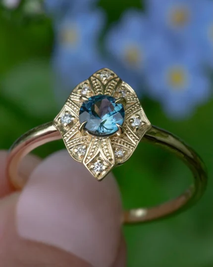 A striking 14K solid gold ring featuring a Montana sapphire in an art deco design, offering a vintage-inspired and elegant touch to any jewelry collection.