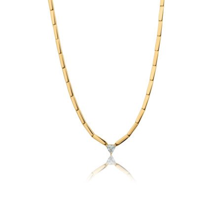 The 18k Gold Triangle Diamond Bar Necklace features a sleek bar design adorned with a 0.30-carat diamond, set in a triangle shape. Adjustable from 16 to 18 inches, this elegant necklace adds a touch of sophistication to any outfit, perfect for both everyday wear and special occasions.
