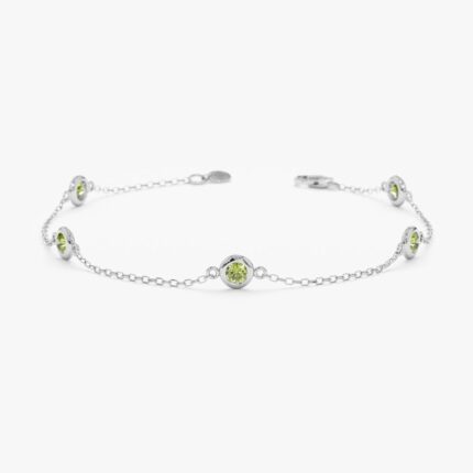A delicate 14K solid gold bracelet featuring vibrant peridot stones in a station design, offering a timeless and elegant addition to any jewelry collection.