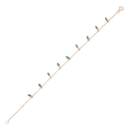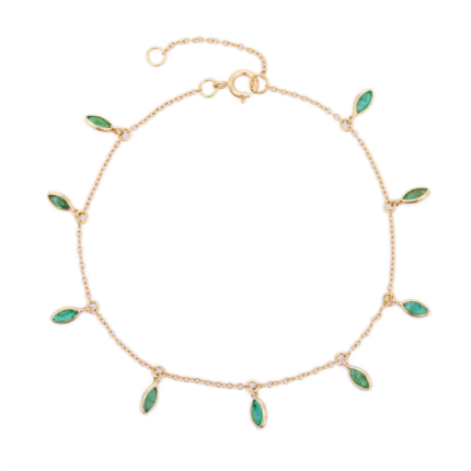 Elegant 14K solid gold charm bracelet featuring marquise-cut emeralds. A sophisticated piece that adds vibrant color and timeless charm to your wrist.