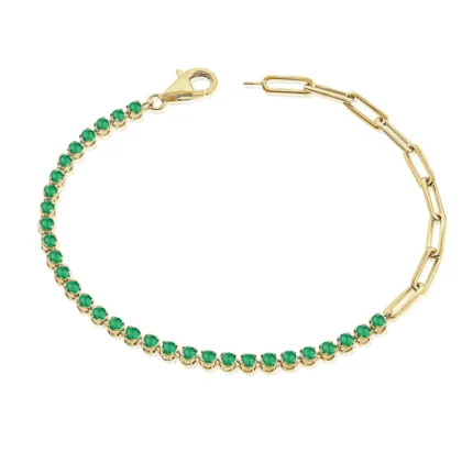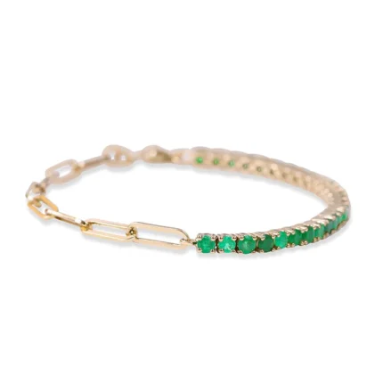 A chic 14K solid gold bracelet featuring half emeralds in a tennis design combined with paperclip chain links, offering a modern and elegant look.