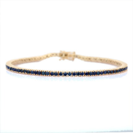 A stunning 18k solid gold tennis bracelet featuring vibrant blue sapphires, offering a timeless and elegant design perfect for any occasion.