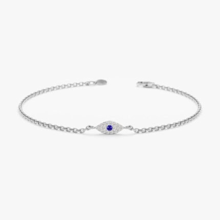 A sleek evil eye bracelet in 18K solid gold, accented with natural diamonds and a rich blue sapphire for everyday protection with polished sparkle.