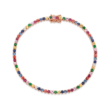 Get this Product in 14K GoldA refined Hepburn-style bracelet in 18K solid gold, set with vibrant multi-coloured sapphires and sparkling natural diamonds for effortless day-to-night elegance.