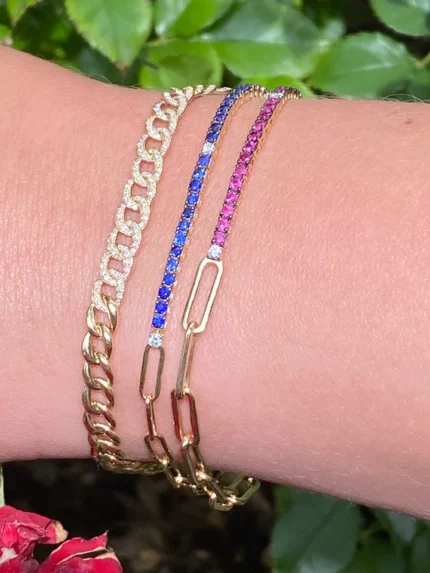 Get this Product in 18K GoldElegant 14K solid gold half sapphire and diamond tennis bracelet with a unique paperclip chain design, perfect for adding sophistication to any outfit.