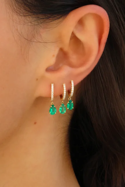18k Solid Gold Single Diamond Huggie With Pear-Shaped Emerald Drop