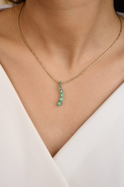 This 14K solid gold pendant showcases a unique long design with a vibrant emerald centerpiece—elegant, modern, and full of timeless charm.