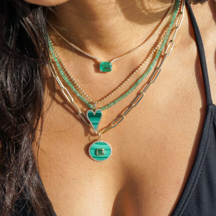 Striking 14K solid gold round medallion pendant featuring malachite and emerald—crafted for bold elegance, natural beauty, and timeless charm.