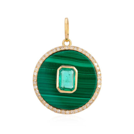 Striking 18k solid gold round medallion pendant featuring malachite and emerald—crafted for bold elegance, natural beauty, and timeless charm.