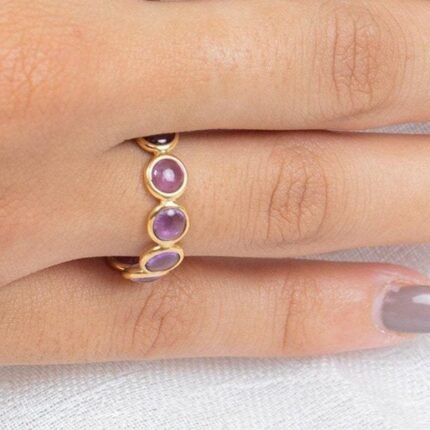A stunning 18k solid gold eternity band featuring vibrant amethysts, offering a timeless and elegant design perfect for symbolizing eternal love.