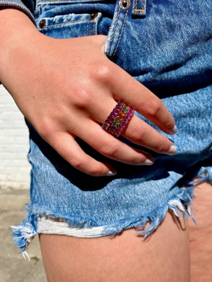 This elegant 14K solid gold eternity band features stunning emerald-cut purple amethysts, offering a vibrant and sophisticated touch for any occasion.