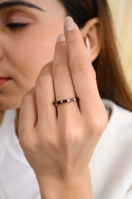 Get this Product in 14K GoldA sleek 18k solid gold half eternity band featuring baguette-cut garnets, offering a vibrant and elegant design that symbolizes lasting love.