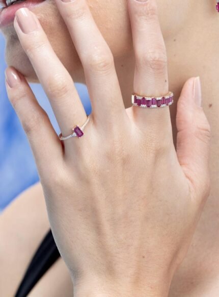 A striking 18k solid gold ring featuring baguette-cut rubies and sparkling moissanite diamonds, offering a vibrant and luxurious design for any occasion.