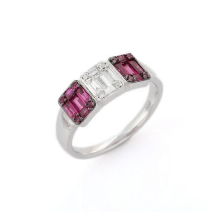 18K Solid Gold Baguette Ruby and Moissanite Diamond Ring