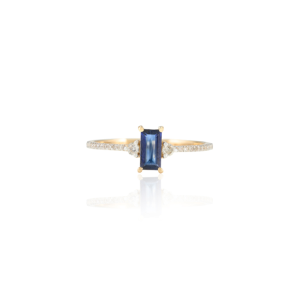 Get this product in 14k goldA luxurious 18k solid gold ring featuring a baguette-shaped blue sapphire and sparkling diamonds, offering a sophisticated and elegant design.
