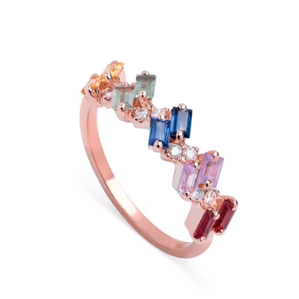 Get this Product in 14K GoldChic 18k solid gold ring featuring dazzling diamonds and baguette-cut pink sapphires—perfect for a touch of vibrant elegance and charm.