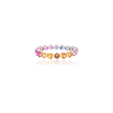 Stunning 18k solid gold eternity band featuring a vibrant array of multi-colored sapphires, creating a colorful and elegant statement piece.
