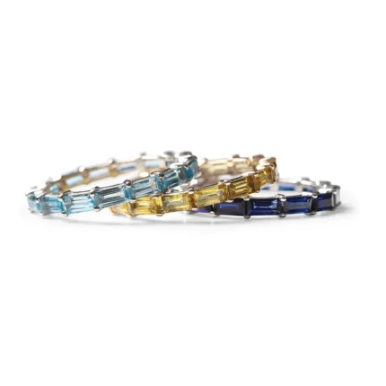 Elegant 14K solid gold eternity band with baguette blue topaz and diamonds, creating a brilliant and vibrant piece that exudes sophistication.