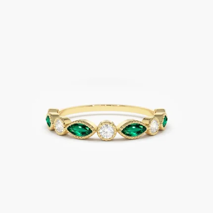 Elegant 14K solid gold wedding band featuring marquise-cut emeralds and sparkling diamonds—crafted for timeless beauty and natural brilliance.