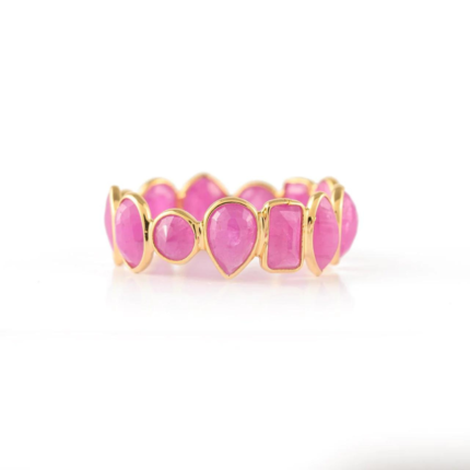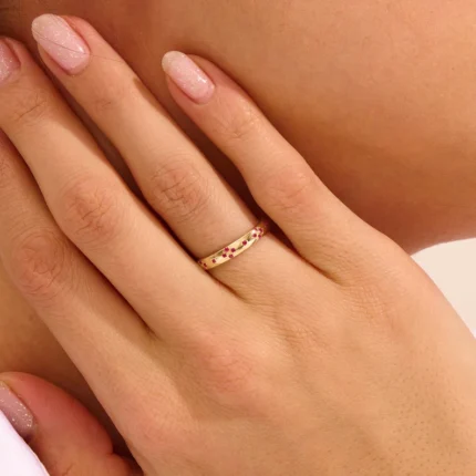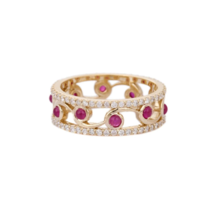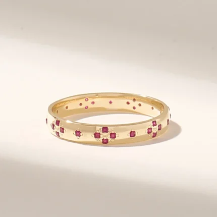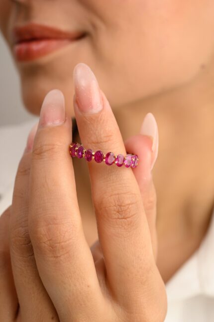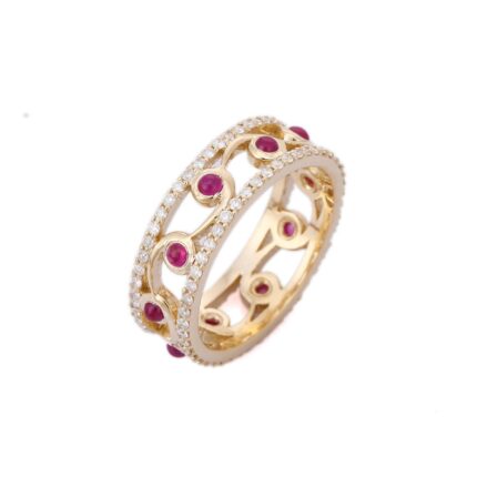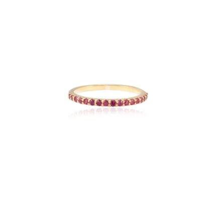 Timeless 18k solid gold eternity band adorned with vivid red rubies—crafted for lasting elegance, bold color, and everyday sophistication.