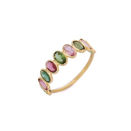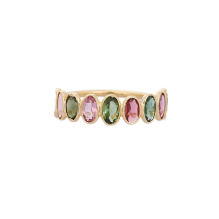 Chic 18k solid gold half eternity band adorned with vibrant tourmalines. A colorful, elegant design perfect for stacking or wearing solo.