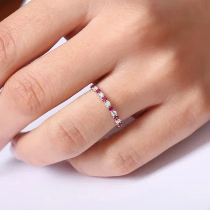 Elegant 18k solid gold wedding ring featuring shared prong-set rubies and diamonds—crafted for timeless brilliance and romantic sophistication.