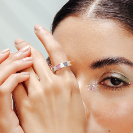 Chic 18k solid gold band adorned with vibrant multi-color sapphires—crafted for a playful yet elegant look that suits any occasion.