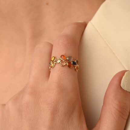 Colorful and distinctive, this 14K solid gold half eternity band showcases unique multi sapphires—perfect for vibrant stacking or special occasions.