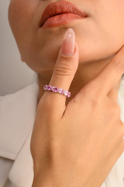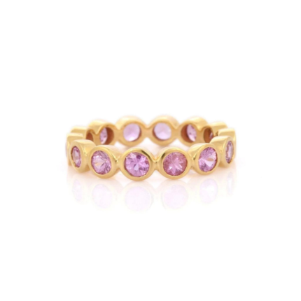 Elegant 14K solid gold eternity band adorned with sparkling pink sapphires, perfect for adding a delicate pop of color to your jewelry collection.