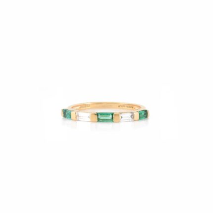 Elegant 14K solid gold band ring featuring vibrant emeralds and sparkling diamonds in a refined, timeless design for everyday or special occasions.