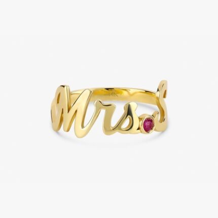 Get this Product in 14KÂ GoldElegant 18k solid gold "Mrs." title and initial ring with a gemstone, combining personalization and sophistication for a meaningful and timeless piece.