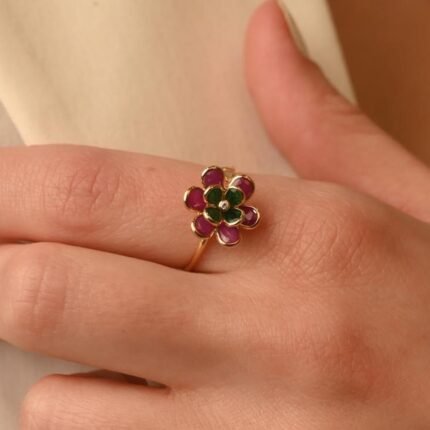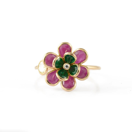 18K Solid Gold Multi Precious Gemstone Flower Ring