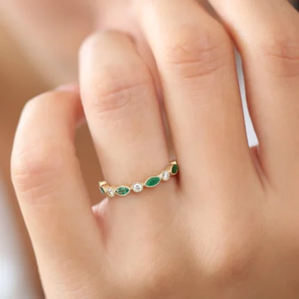 18K Solid Gold Marquise Emerald and Diamond Wedding Band