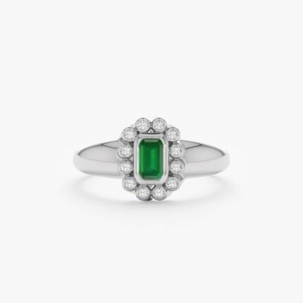 Get this Product in 14K Gold18k solid gold engagement ring with 0.17 ct lab-certified emerald and 0.08 ct GIA-certified diamonds (G-H/VS-SI). 4×9.5 mm setting, BIS Hallmarked.