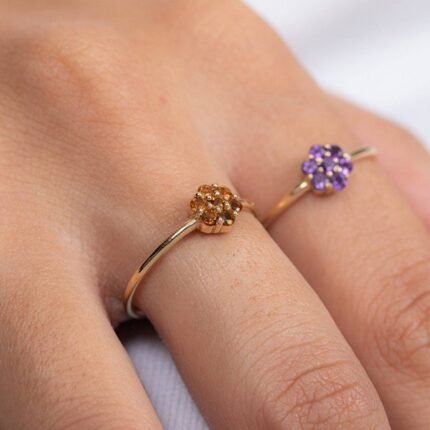 Get this Product in 14KÂ GoldDiscover the 18k Gold Amethyst Ring, adorned with 7 round amethysts totaling 0.40 ct. Weighing 1.412 grams, this stunning piece is set in a prong setting, offering timeless elegance and style.