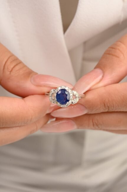 Get this Product in 14K GoldExperience sophistication with the 18k Solid White Gold Blue Sapphire Diamond Statement Ring, showcasing a stunning 1.51 carat oval blue sapphire complemented by 0.37 carats of diamonds in white gold.
