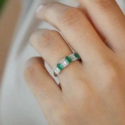 Get this Product in 14K GoldExquisite 18k solid gold ring with baguette and round diamonds, paired with a genuine emerald, offering a striking and elegant design for any occasion.