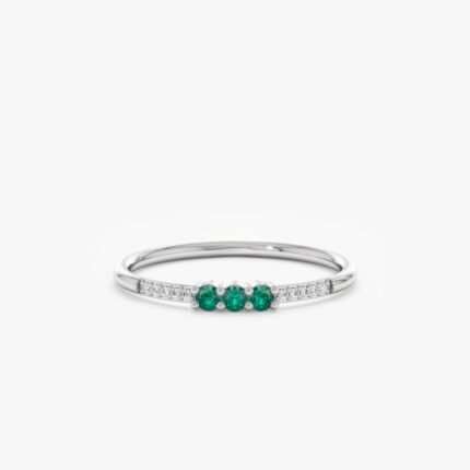 18k gold ring with 0.09 ctw natural emerald and 0.05 ctw GH/VS-SI diamonds. GIA certified, slim 1.3 mm band.