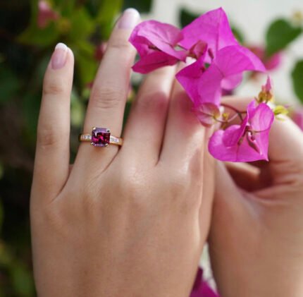 18K Solid Gold 1.74 ct Long Cushion Deep Pink Garnet Ring
