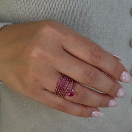 A stunning 18k solid gold ring featuring multiple wraps with a heart-shaped ruby at the center, offering a romantic and elegant design.