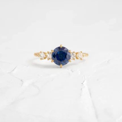 14K Solid Gold Round Cut Blue Sapphire Ring