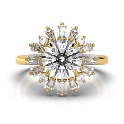 Get this Product in 14K GoldThis 18k solid gold ring features a halo of baguette moissanite diamonds around a brilliant center stone—offering timeless elegance with a bold sparkle.
