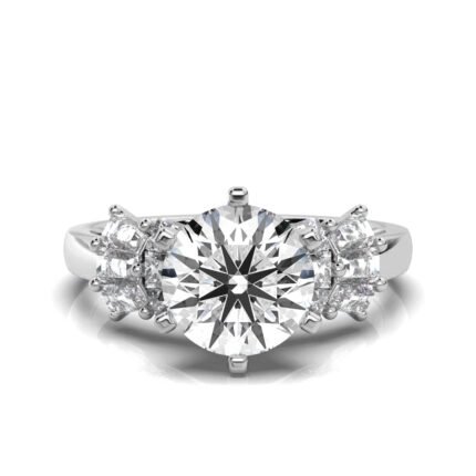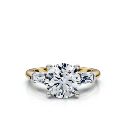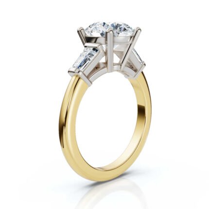 Get this Product in 14K GoldExude elegance with the 18k Solid Gold Three Stone Tapered Baguette Moissanite Diamond Engagement Ring, featuring a 2ct center stone and 0.5ct tapered baguette side stones.