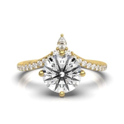 Get this Product in 14K GoldElegant V-shaped Moissanite diamond engagement ring featuring a 2ct round center stone with round and pear-cut side diamonds, set in 18k solid gold.