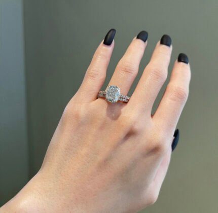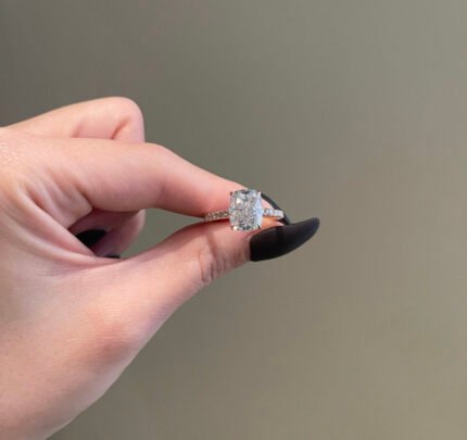 This 4ct cushion cut moissanite engagement ring with 1ct side diamonds offers luxurious sparkle and classic charm—perfect for an unforgettable proposal.
